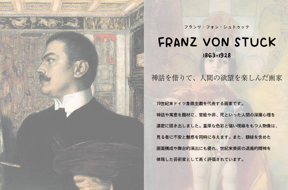 ドイツ象徴主義を代表する画家・彫刻家・建築家です。ミュンヘンを拠点に活動し、神話や寓意を題材とした官能的で重厚な作品で知られています。とくに《罪》《サロメ》《ルシファー》など、運命や欲望、死といった主題を妖艶かつ劇的に描き、世紀末美術の精神を体現しました。画面を縁取る装飾的な額縁も自ら設計し、絵画と建築・デザインを統合する姿勢を示しています。また、後にミュンヘン美術院の教授となり、教え子にはカンディンスキーやクレーなどがおり、20世紀美術への橋渡し的存在と評価されています。