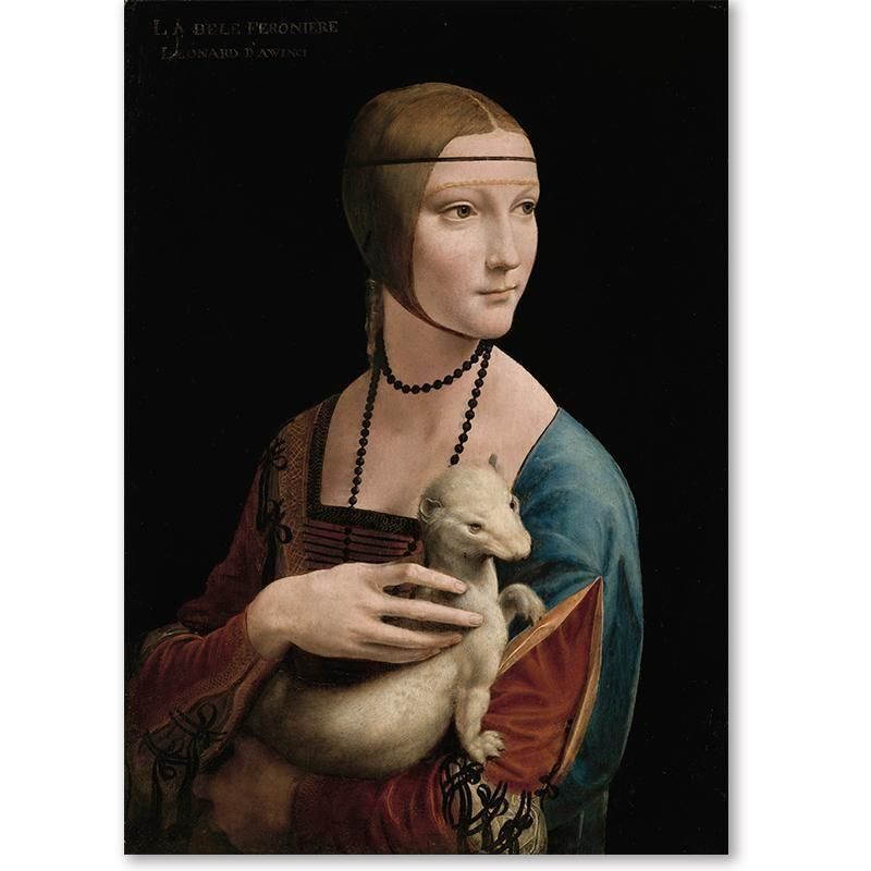 ルネサンスの巨匠、レオナルド・ダ・ヴィンチが、ミラノ公ルドヴィーコ・スフォルツァの愛人であったチェチリア・ガッレラーニを描いた肖像画の傑作です。黒い背景の中に浮かび上がる女性は、優雅な衣装をまとい、鋭い知性を感じさせる横顔で遠くを見つめています。彼女が抱く白貂(アーミン)は、単なるペットではなく、純粋さや高貴さ、そしてルドヴィーコ公の紋章を象徴する謎めいたモチーフです。レオナルド独自のスフマート(ぼかし)技法と、捻られた(ひねられた)身体の構図が、人物に動きと内面の深みを与え、ルネサンスの理想的な美と知性を完璧に融合させています。