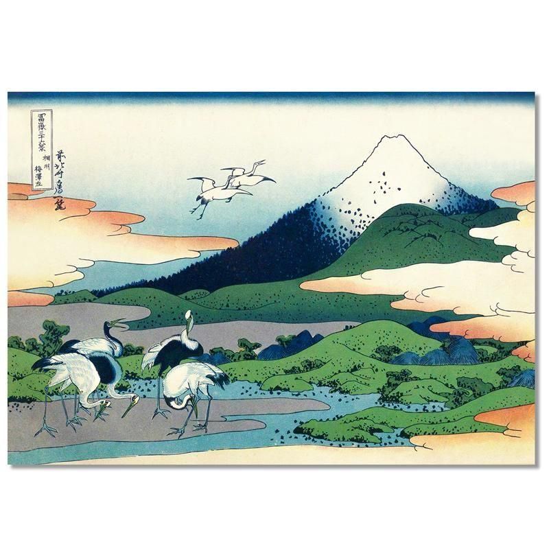 葛飾北斎 浮世絵 冨嶽三十六景 相模国 梅沢湿原 富士山 鶴 吉祥 風景画 遠近法 江戸時代 伝統芸術 日本美術 木版画 大判錦絵 構図 色彩 傑作 自然描写 悠久 神聖 湿地 伝統文化
