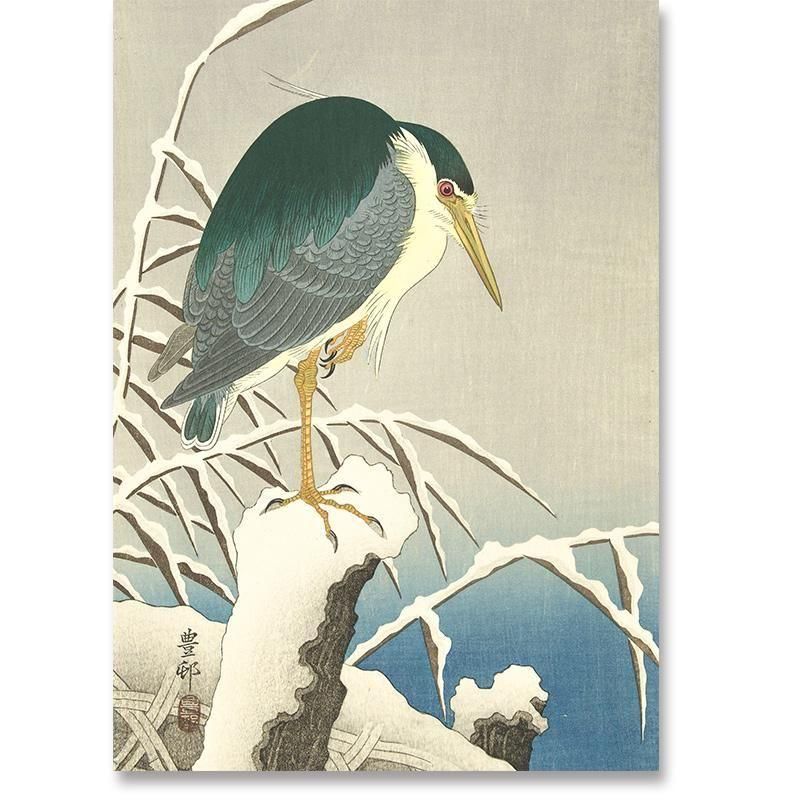 小原古邨 ゴイサギ 夜鷺 サギ 雪 新版画 木版画 浮世絵 花鳥画 渡辺庄三郎 芸術 美術 版画 日本画 鳥 冬 水辺 狩り 孤高 繊細 伝統 輸出 大正 昭和初期 集中力