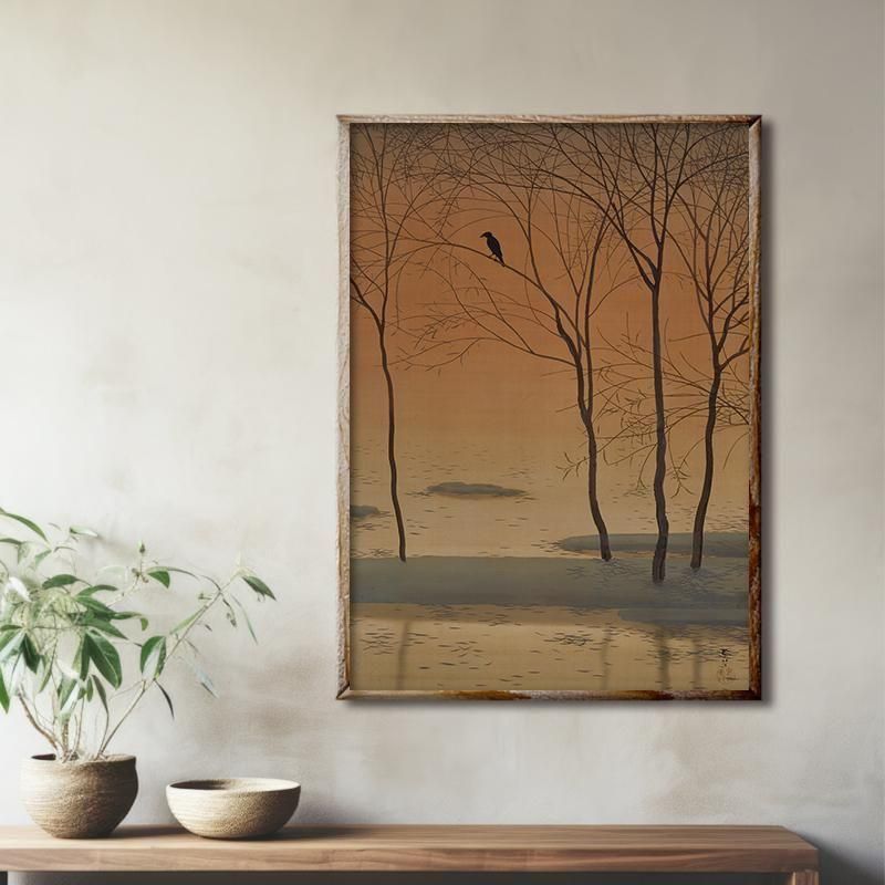 黄昏時の曖昧な光が、見る者の心を深く捉えます。菱田春草の暮色図は、冬の終わりに訪れる、どこか切なくて詩的な一瞬を捉えたドラマティックな作品です。温かい橙色の空と、冷たい水面や雪解けの氷が溶け合う様は、静寂の中に潜む季節の変わり目の微かな緊張感を伝えています。輪郭をぼかし、細部をあえて曖昧にする朦朧体の技法により、空気そのものが湿った光を放っているかのような幻想的な表現が生まれています。中央に佇むカラスのシルエットは、この静寂の中で唯一確固たる存在感を放ち、鑑賞者の感情を一点に引き寄せます。凍てつく世界で孤独を抱えながら、懸命に生きる生命の象徴のようです。