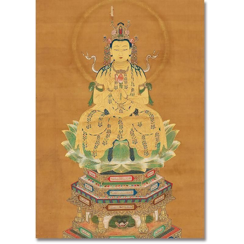 金色の光をまとって現れた聖観音の姿は、まさに慈悲の化身がこの世に降臨したかのような荘厳なドラマを感じさせます。穏やかな表情と均整の取れた身体の描写は、衆生の苦悩を見つめながらも揺るがない仏の意志を伝えています。特に頭光と金泥の装飾は、神聖な輝きを放ち、希望の光を象徴しています。