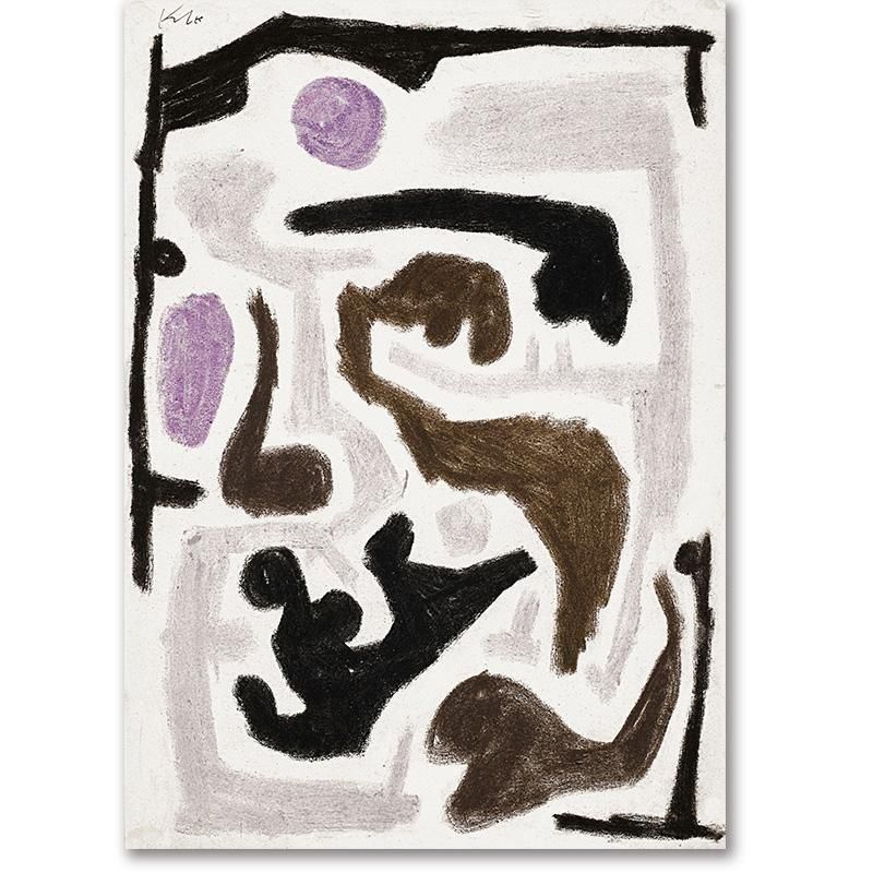 単純化された茶色や緑の色彩と幾何学的な形で、大地に散らばる木々の破片や薪のようなモチーフを描いています。抽象的な構成の中に自然の力によって破砕された木の構造と、そのものが持つ本質的な強さを感じさせます。クレーが見つめた物質の根源への思索が込められた作品です。