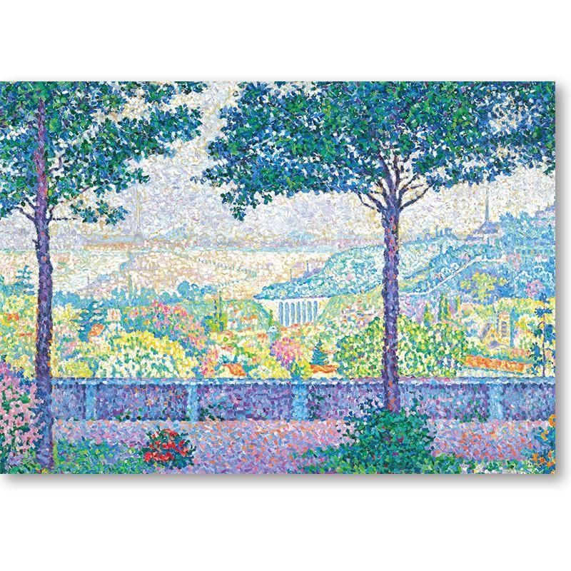 全体に広がる無数の色彩の点が、ムードンの丘からの壮大な眺望に生命力を与えています。手前の濃い緑と、遠景の淡く霞んだ街並みの対比が、空間の奥行きと静かな感動を生み出しています。青、緑、ピンクといった色が緻密に構成された樹々と遠景の風景は、まるで宝石のきらめきのようです。この作品は、セーヌ川沿いの穏やかな日常と、都市の広がりを詩的な感性で捉えており、光と色彩の調和を通して自然の偉大さと安らぎを伝えています。観る者の心に静かな高揚感と旅情を呼び起こす傑作です。