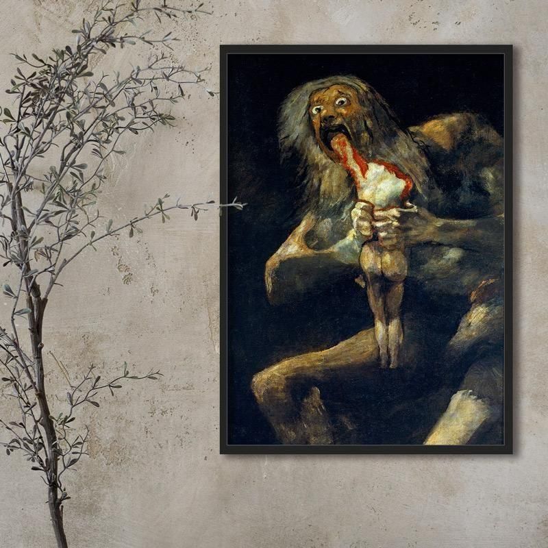 フランシスコ・デ・ゴヤの「Saturno devorando a su hijo」、通称サトゥルヌス我が子を喰らうは、黒い絵の連作に含まれる油彩の傑作です。スペインのロマ主義の画家が晩年の1819年頃、プリンス・ピオの丘の自宅の壁画として描きました。この作品は、クロノスの神話を題材に、狂気、暴力、そして絶望といった人類の暗黒面を描き、恐怖を表現する表現主義的な力強さがあります。普遍的テーマとして時間の暴虐を象徴するこの作品は、ゴヤの思想が凝縮されたものです。