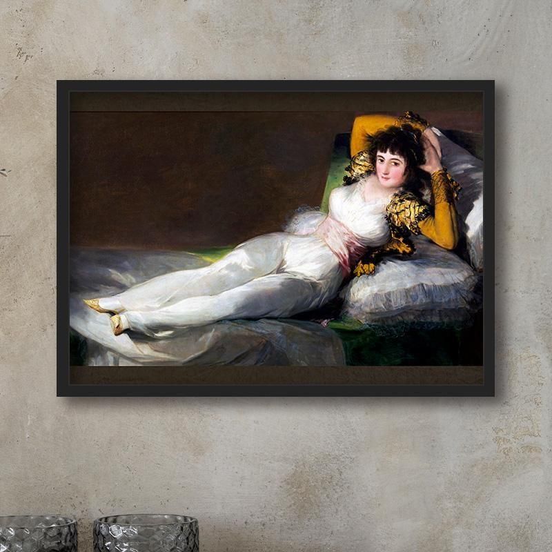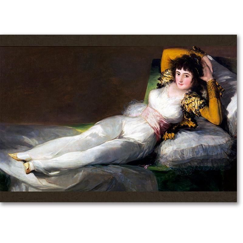 『裸のマハ』と対をなすこの作品は、同じポーズで横たわる女性が、当時のマドリードの流行である華やかなマハ(庶民的な美女)の衣装(アンダルシア地方の民族衣装)を身につけて描かれています。白く薄い絹の衣服と金色の刺繍、そして枕元のレースのディテールは、官能的な美しさと時代特有の優雅さを表現しています。しかし、この絵が持つ最もドラマティックな側面は、その存在自体が「裸のマハ」の存在を暗示している点です。服を着たこの姿は、禁断の裸体を隠す「ベール」として機能し、観る者に「服の下には何があるのか」という好奇心と緊張感を与えます。この二枚の絵は、道徳的なタブーと芸術的な表現の間で揺れ動いた、ゴヤの時代の秘密を象徴する連作なのです。