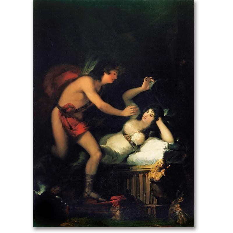 深く暗い闇に覆われる中、神話の登場人物である愛の神キューピッドと、魂の象徴であるプシュケの逢瀬の瞬間が浮かび上がっています。半裸のキューピッドが、横たわるプシュケに手を差し伸べ、彼女は驚きと同時に甘美な誘惑を受け入れているようです。このドラマティックな描写は、単なる神話の一場面ではなく、理性と情熱、精神と肉体の禁断の邂逅を象徴しています。ゴヤがこの時期に描いた他の官能的な作品(裸のマハなど)と並び、この絵もまた、古典的な主題にロマン主義的な情念と深い官能性を吹き込んでいます。光と闇の劇的な対比は、秘密の逢瀬と、人間の愛の根源的な力を表現した、息をのむほどに美しい傑作です。