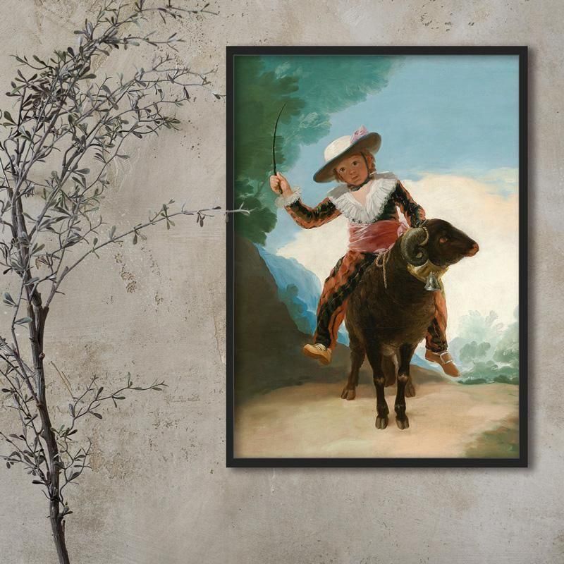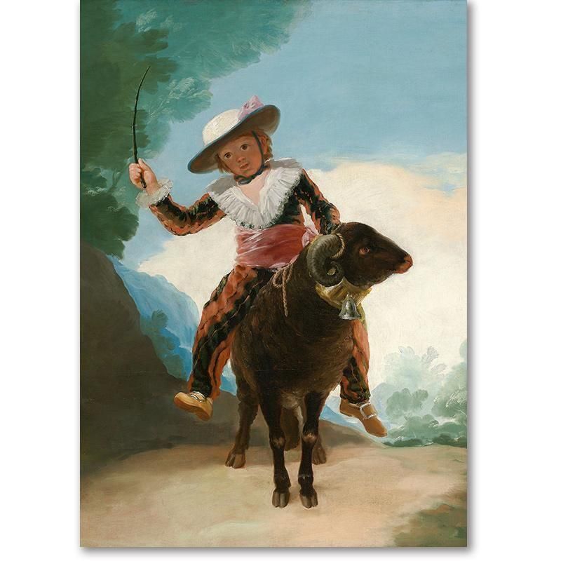 この作品を描いた1786年頃、ロココ的な優美さを残しつつも、ロマン主義へと向かう独自のリアリズムを探求していました。背景の青空と緑の木々は、この時代の明るい感性を映し出していますが、少年の真摯な眼差しには、表面的な美だけでなく、人間そのものを見つめるゴヤの深い洞察が感じられます。これは、歴史の転換期に描かれた、光と希望に満ちた時代の肖像です。晴れやかな青空と緑豊かな風景を背景に、フリル付きの服と麦わら帽子をかぶった少年が、大きな角を持つ雄羊にまたがっています。雄羊には装飾的な鈴がつけられ、少年は手に鞭を持っていますが、その表情は明るく、無邪気な子供の姿と動物との親愛が牧歌的なムードを生み出しています。