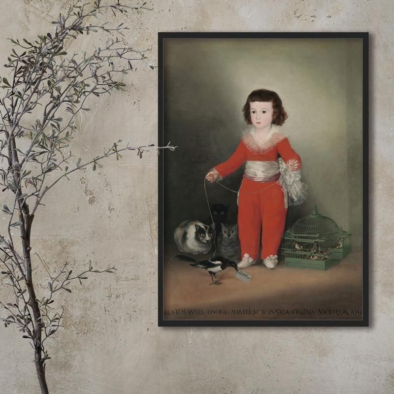フランシスコ・デ・ゴヤが描いたマヌエル・オソリオは、ゴヤ 名画として知られるスペイン絵画の傑作で、18世紀肖像画の魅力を象徴しています。赤い衣装を身にまとった貴族の子どもを中心に、カササギや猫と少年、そして鳥籠が添えられ、当時の上流階級文化を繊細に伝えます。作品は芸術鑑賞や絵画解説の対象として人気があり、絵画の魅力や子どもの肖像の表現を学ぶ上でも重要です。美術史やヨーロッパ美術の文脈でも語られる名作アートであり、クラシックアートとしての価値も揺るぎません。