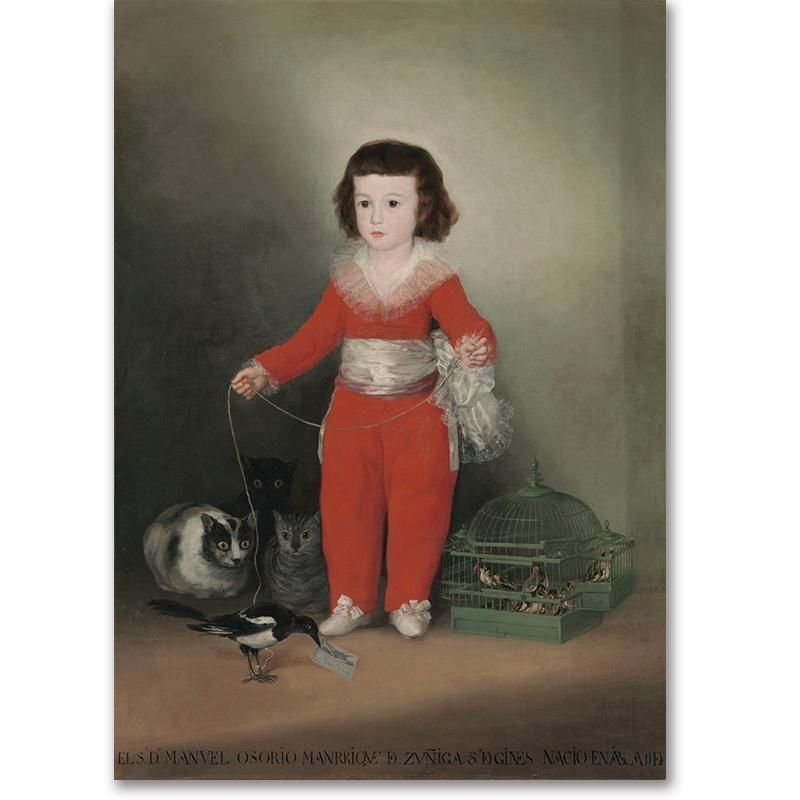 フランシスコ・デ・ゴヤ マヌエル・オソリオ ゴヤ名画 スペイン絵画 18世紀肖像画 赤い衣装 貴族の子ども 美術館コレクション メトロポリタン美術館 古典絵画 油彩肖像画 芸術鑑賞 絵画解説 絵画の魅力 子どもの肖像 カササギ 猫と少年 鳥籠 上流階級文化 美術史 名作アート ヨーロッパ美術 クラシックアート アートポスター 絵画作品紹介
