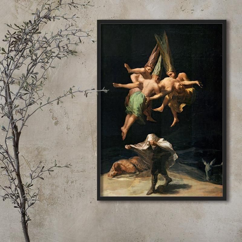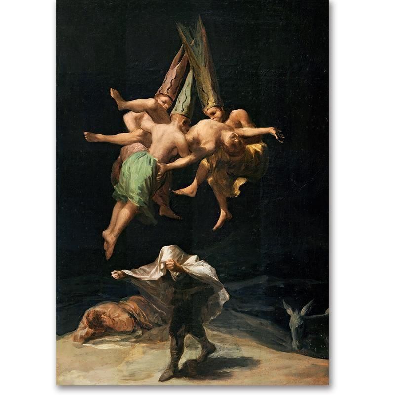 魔女の飛翔を題材にしたスペイン絵画で、夜の場面に潜む超自然的主題が特徴です。怪異描写を通して18世紀絵画らしい物語性のある絵画を示し、暗闇の表現や光と影の対比が不穏な雰囲気を生みます。絵画分析が重要となり、人物描写や心理的描写が緊張感のある構図を支えています。ヨーロッパ絵画の伝統絵画としての画面構成や歴史背景も読み取れ、人間の恐れを空想的主題とともに扱っています。視線の演出が芸術作品としての絵画表現を深めています。