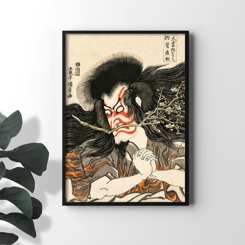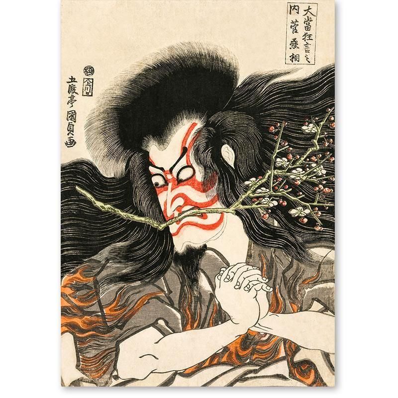 忍者 錦絵 歌舞伎 浮世絵 菅原伝授手習鑑 菅丞相 天拝山 雷神 隈取 梅 飛梅 市川團十郎 江戸時代 日本文化 伝統芸能 木版画 伝説 英雄 怨念 火炎 意匠 色彩 構図 役者絵 歴史