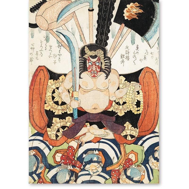 江戸時代の日本文化において、武蔵坊弁慶は剛勇な英雄として多くの錦絵に描かれました。この浮世絵は、七代目市川團十郎が不動明王に見立てて弁慶を演じる劇的な一場面を色彩豊かに捉えています。忍者のような隠密性とは対照的に、背後に七つ道具を背負い、利剣と数珠を手に憤怒の隈取を施した姿は、木版画独自の構図によって力強く表現されました。仏法を守護する神聖な伝説と、伝統芸能である歌舞伎の様式美が融合したこの意匠は、歴史的な価値を持つ役者絵の最高傑作と言えます。