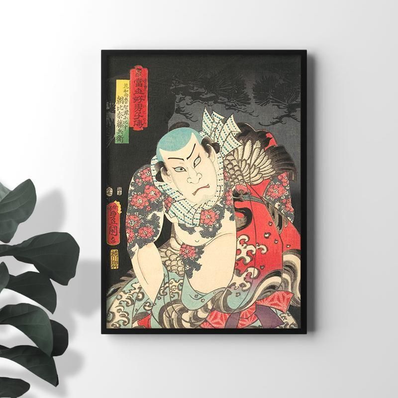 江戸時代の日本文化を象徴する浮世絵の中でも、英雄の剛勇さを描いた錦絵は庶民を熱狂させました。本作は『水滸伝』の花和尚魯智深に見立てた朝比奈藤兵衛を、名優の中村福助が演じる姿を捉えた役者絵です。肩に施された桜の刺青や鶴の意匠が、木版画特有の色彩豊かな構図で表現されており、伝説の武勇伝を現代に蘇らせています。忍者のような隠密的な魅力とは異なる、片肌を脱いだ勇壮な立ち姿の様式美は、伝統芸能としての歌舞伎の歴史を感じさせます。シリーズ『当盛好男子傳』の一枚として、当時の粋を凝縮した芸術的な価値を持つ作品です。