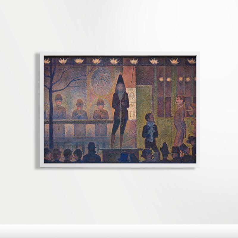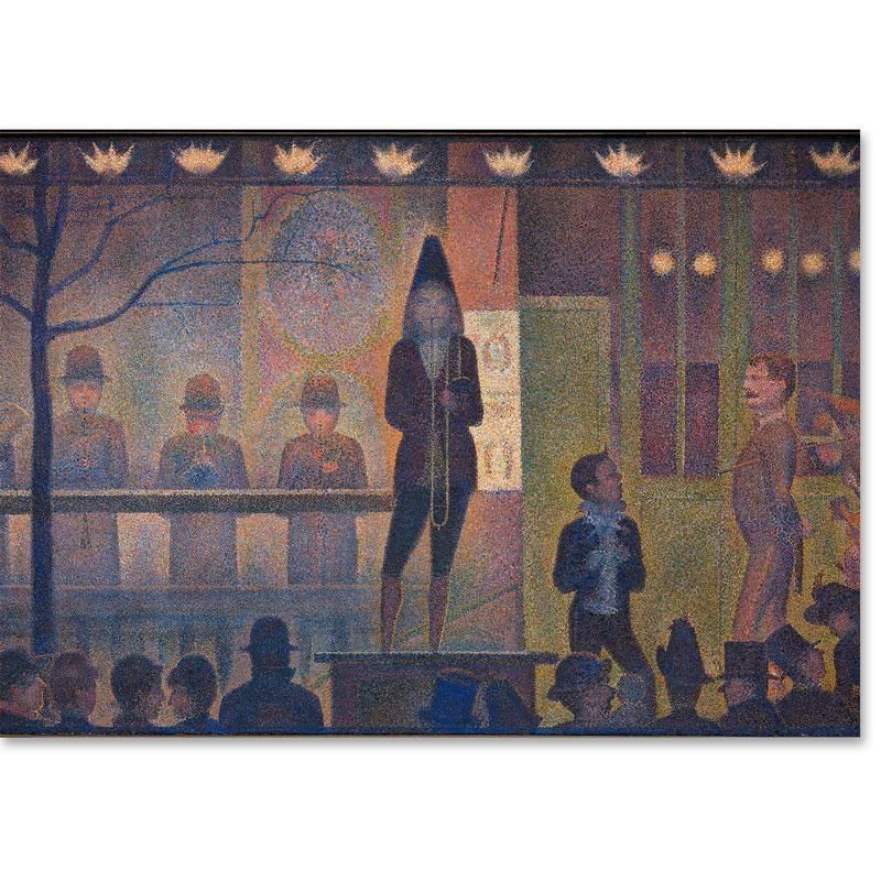 ガス灯の淡い光が夜の帳を照らし出し、サーカスの見世物小屋の前で奇妙な静寂を伴った祝祭が幕を開けます。無数の色彩の点が重なり合い、闇の中に溶け込むような幻想的な夜気と、これから始まる興行への期待感を科学的に、そして情熱的に描き出しています。中央に立つトロンボーン奏者の孤高な佇まいは、華やかな舞台の裏側に潜む芸術家の孤独と、一瞬の輝きに命を懸ける者の誇りを物語っているようです。観客たちのシルエットはまるで静止した彫像のように並び、現実と夢の境界線が曖昧になる不思議な感覚を呼び起こします。点描の一つ一粒が放つ微細な振動は、夜の冷気や楽隊が奏でる旋律の余韻までをキャンバスに封じ込めています。