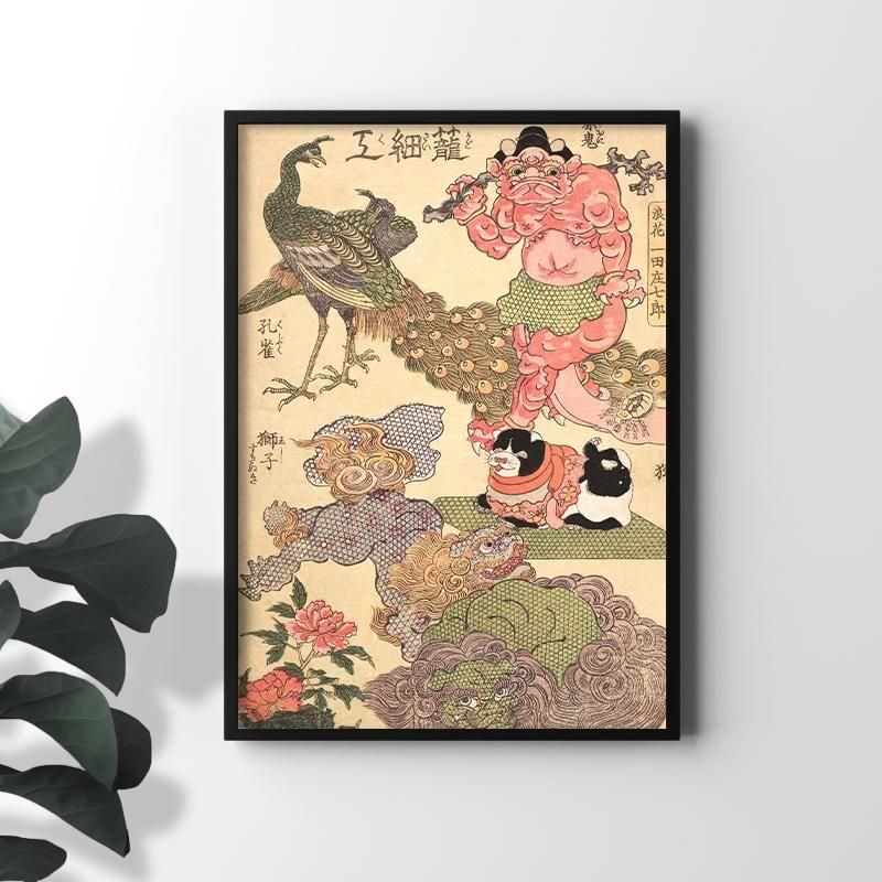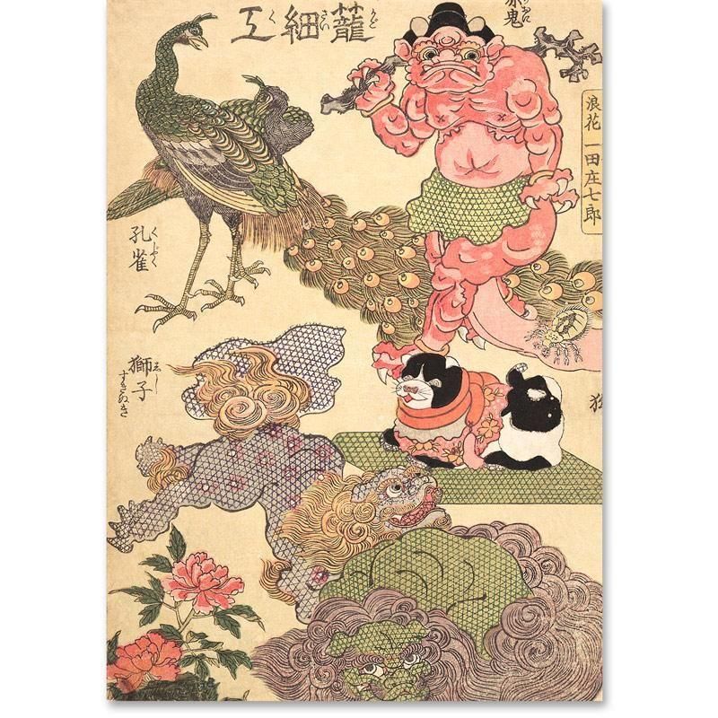 浪速の地が生んだ天才的な細工人である一田庄七郎の手によって、ただの竹や籠が息を呑むような生命を宿した生き物へと姿を変えています。この図譜に描かれた動物や霊獣たちは、竹を編み上げるという極限の技巧によって生み出された籠細工の傑作であり、江戸時代の人々を驚嘆させた見世物興行の熱気を今に伝えています。赤鬼や孔雀、そして唐獅子や愛らしい犬の姿は、編み目の美しさと造形の力強さが融合し、まるで今にも動き出しそうな躍動感に満ち溢れています。国貞の繊細な筆致は、竹素材特有の質感を鮮やかに再現し、職人の執念ともいえる情熱と、それを愛でた大衆の好奇心を一枚の紙の上に封じ込めました。失われた伝統の技が放つ静かな誇りは、時を越えて私たちの感性を刺激し、手仕事の持つ無限の可能性と創造の喜びをドラマティックに物語っています。